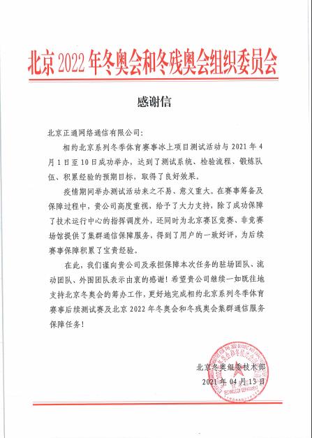 北京正通網絡通信有限公司(簡稱“北京正通”)所運營的800兆數(shù)字集群網作為北京市無線政務網和北京市應急指揮調度系統(tǒng)的數(shù)字集群無線通信平臺,承擔了北京市委市政府及委辦局、市政府應急聯(lián)動系統(tǒng)、市公安局及城管、衛(wèi)生急救等數(shù)十個客戶單位11萬用戶的指揮調度通信服務任務。在2021年上半年系列冬奧測試活動期間,北京正通組成黨員先鋒隊和青年突擊隊,向系列賽事提供800兆集群終端一千余部,派駐現(xiàn)場工作人員三十余人,為場館賽事指揮、日常調度通信提供集群通信服務,圓滿完成了為冬奧各場館內提供關鍵集群語音通信的保障任務。